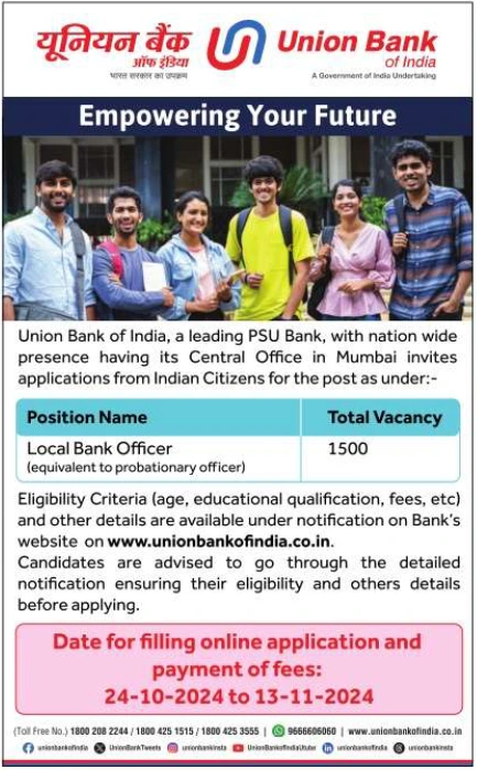 Union Bank of India UBI has released a recruitment notification for graduate Indian candidate for the recruitment of 1500 local bank officers equivalent to probationary officer in various branches of union Bank of India all over the India. The UBI local bank officer vacancy online registration start from 24th October 2024 to 13th November 2024.